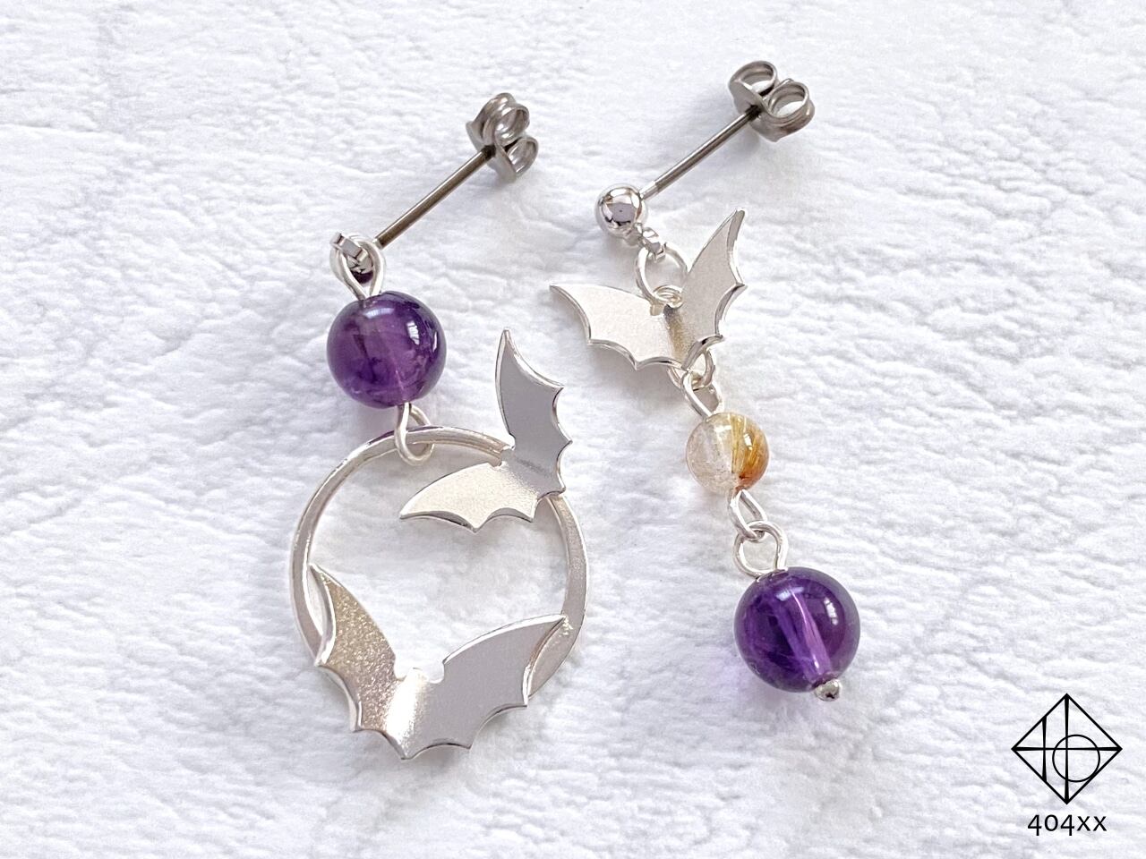ゆらゆら揺れる蝙蝠のモチーフに、夜空をイメージした濃い色合いのアメジストとルチルクォーツを組み合わせた耳飾りです。