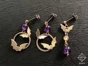 ゆらゆら揺れる蝙蝠のモチーフに、夜空をイメージした濃い色合いのアメジストとルチルクォーツを組み合わせた耳飾りです。